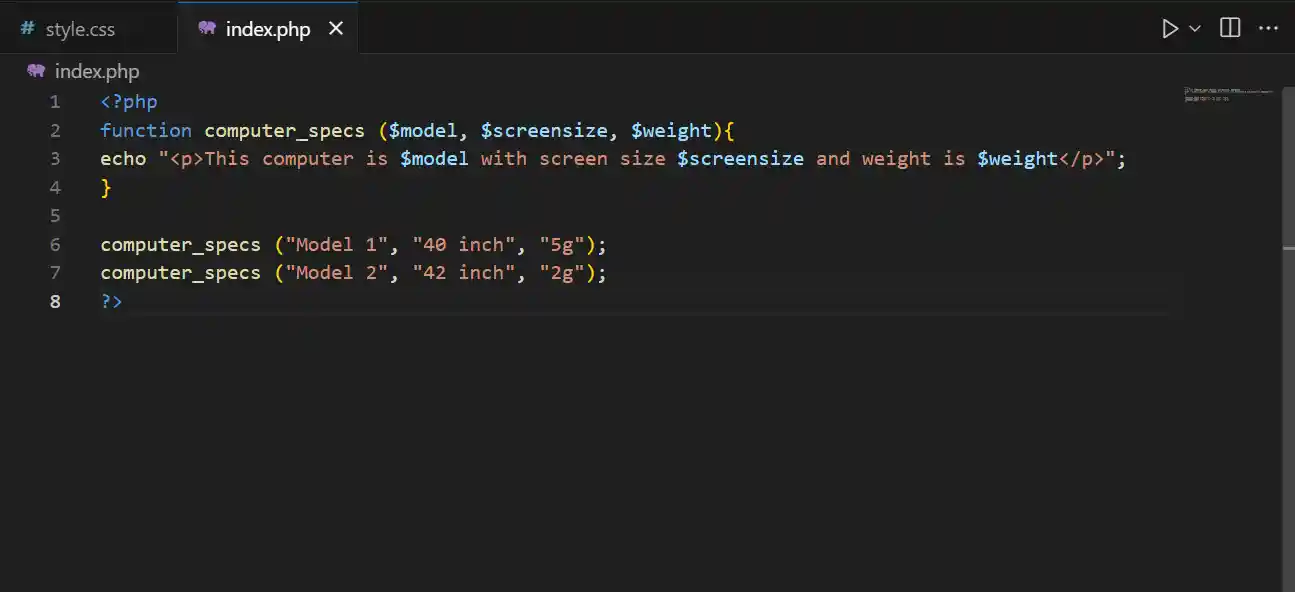 echo "<p>This computer is $model with screen size $screensize and weight is $weight</p>";